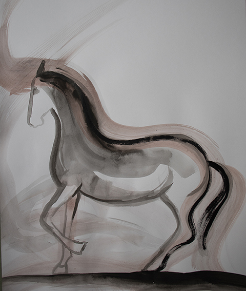 Dynamische (paarden) tekeningen in inkt en dunne acryl.