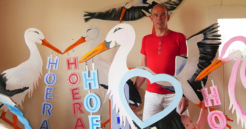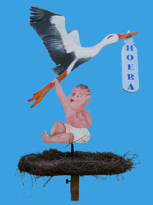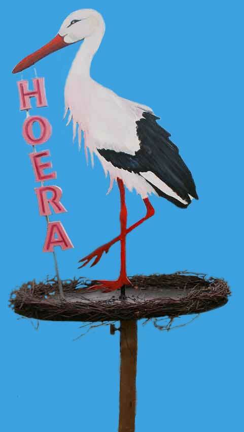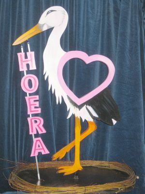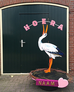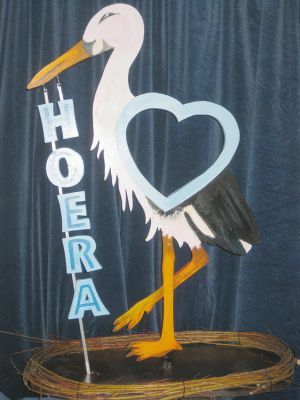 Vanuit mijn atelier verhuur ik diverse home-made geboorte ooievaars. De ooievaars zijn door een eenvoudige constructie gemakkelijk te transporteren en op te zetten. Als er geen tuin beschikbaar is, kan de ooievaar ook d.m.v. een speciale standaard op bv een balkon of een terras staan.