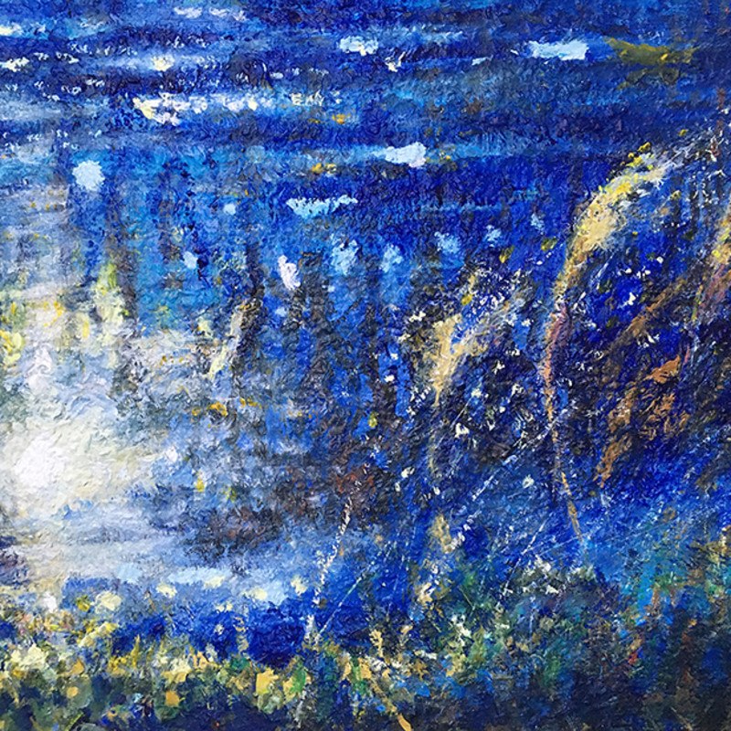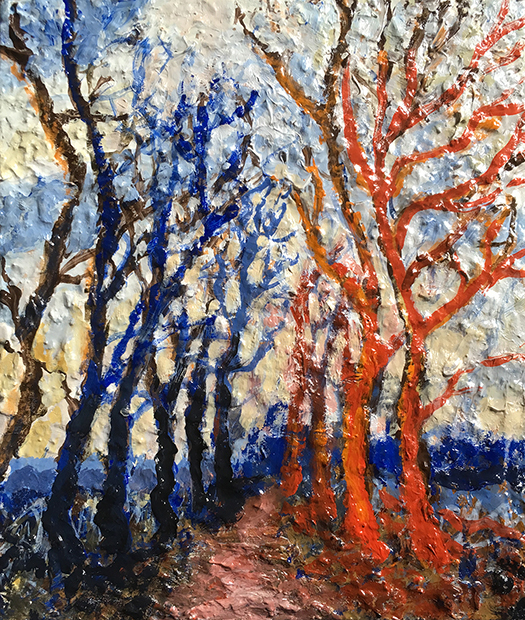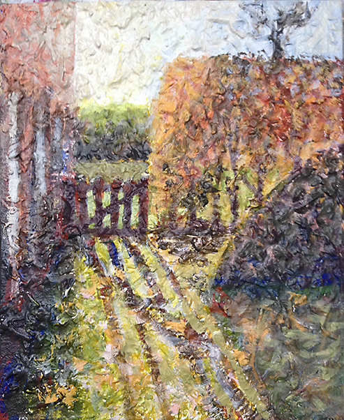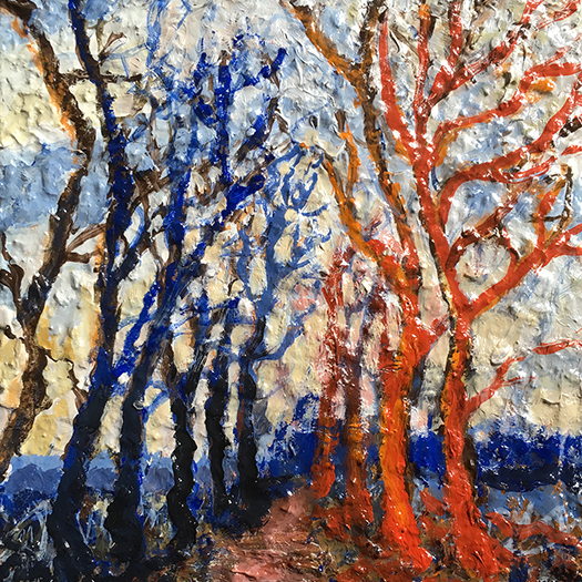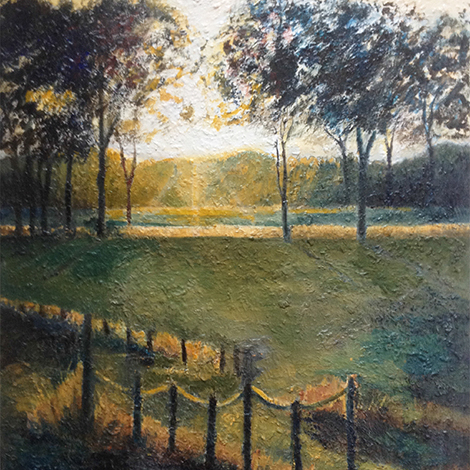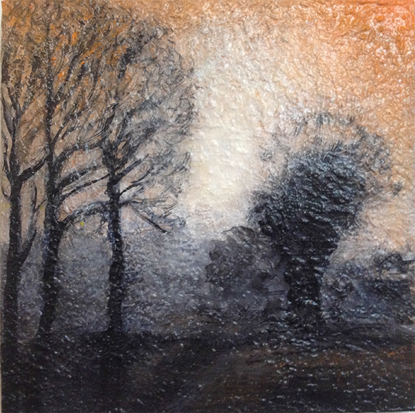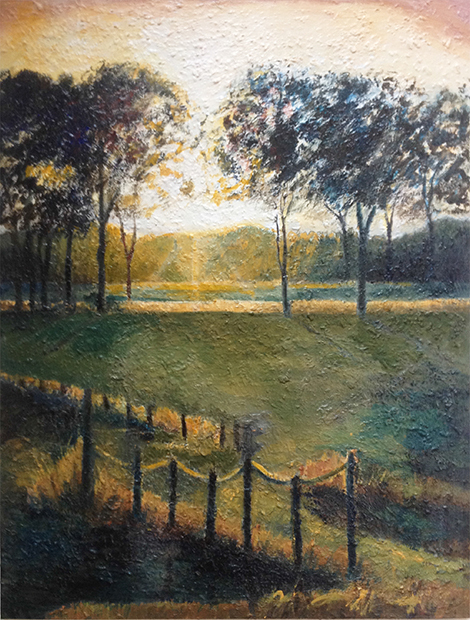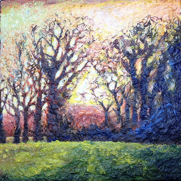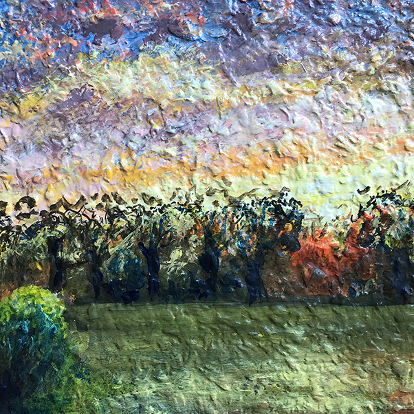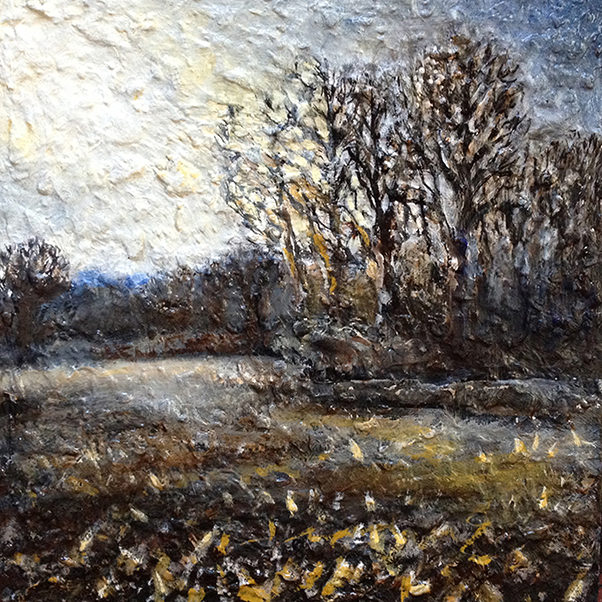 Een greep uit het oeuvre landschappen. De schilderijen met een oppervlaktestructuur zijn gemaakt in een gemengde techniek, waarin houtvezel is verwerkt in de grondlagen.