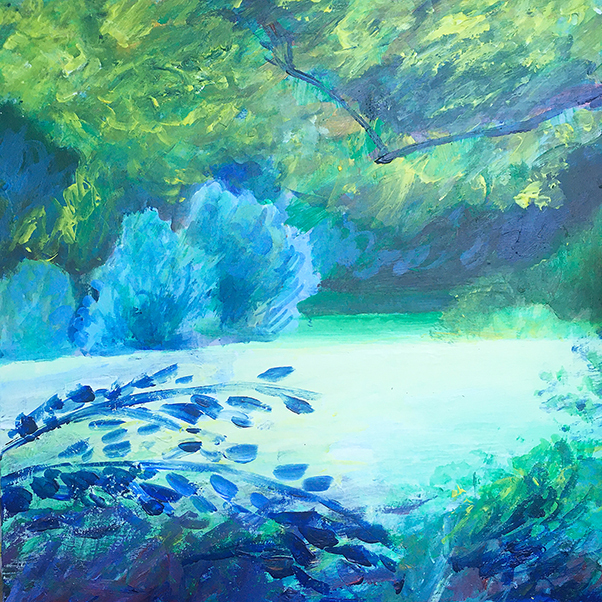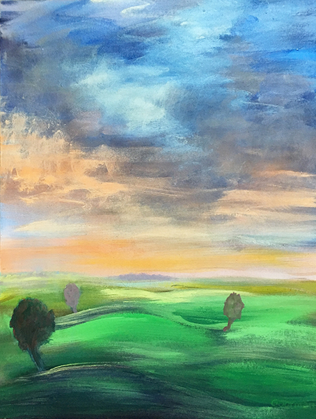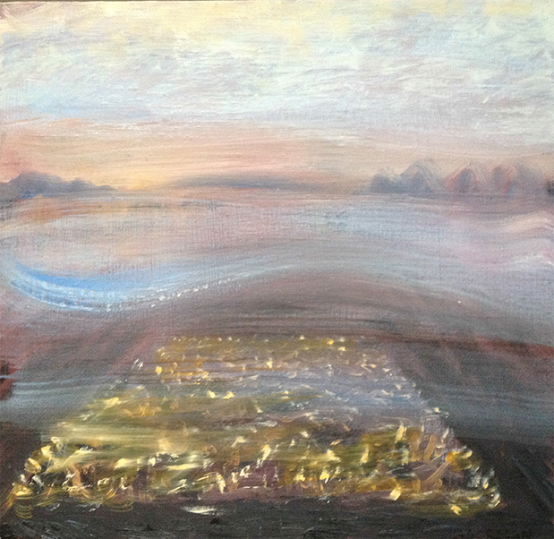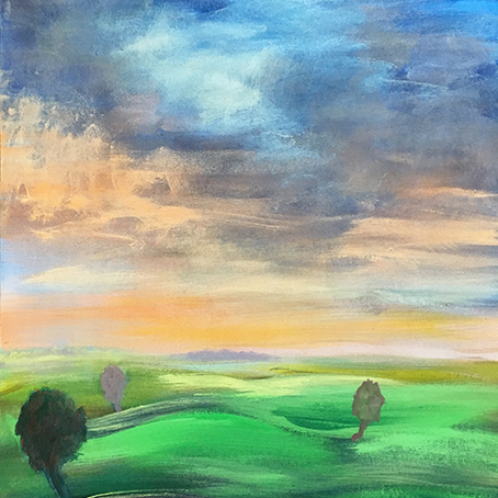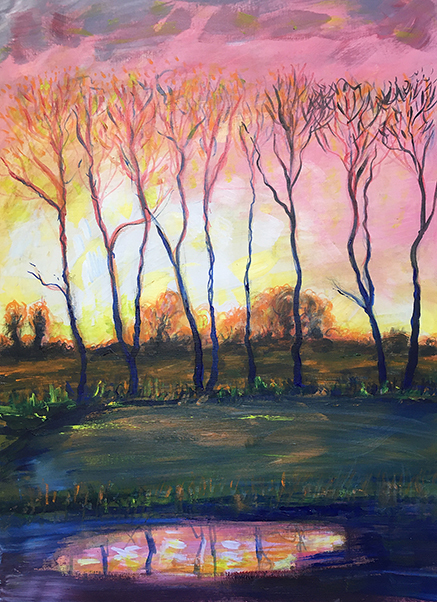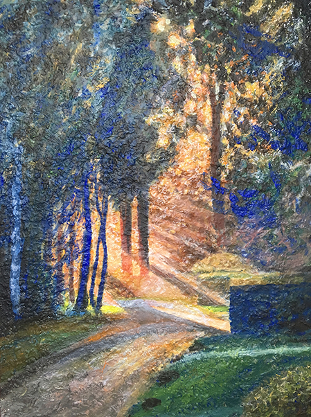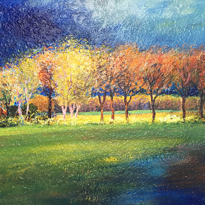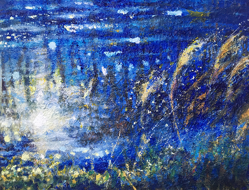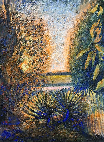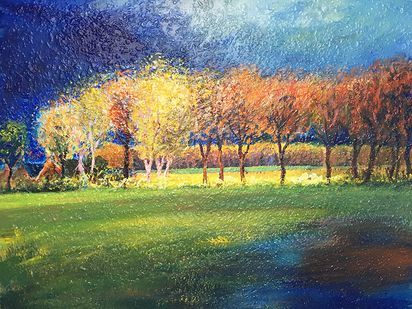 Een greep uit het oeuvre landschappen. De schilderijen met een oppervlaktestructuur zijn gemaakt in een gemengde techniek, waarin houtvezel is verwerkt in de grondlagen.