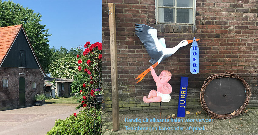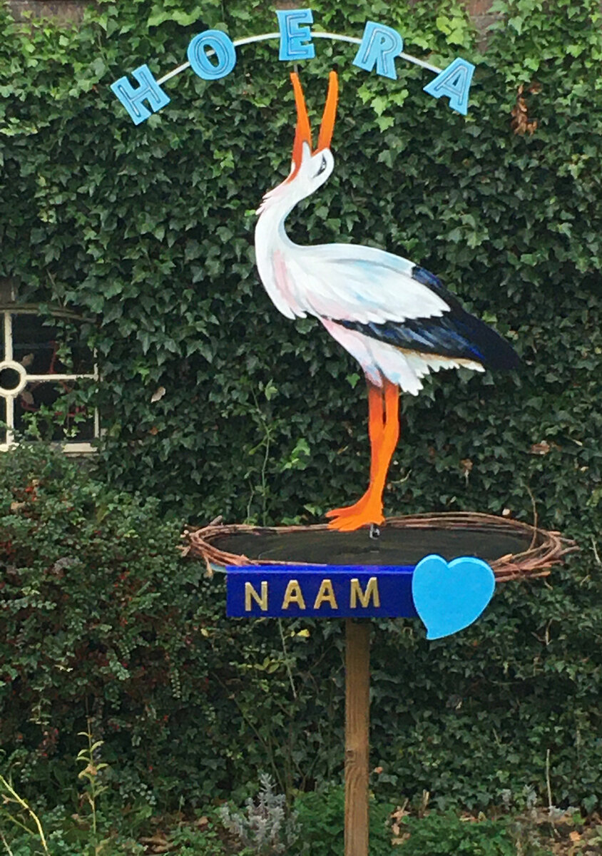 Vanuit mijn atelier verhuur ik diverse home-made geboorte ooievaars. De ooievaars zijn door een eenvoudige constructie gemakkelijk te transporteren en op te zetten. Als er geen tuin beschikbaar is, kan de ooievaar ook d.m.v. een speciale standaard op bv een balkon of een terras staan.